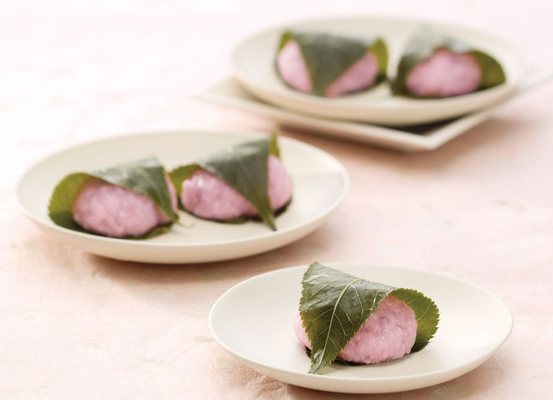 ピンク色のお餅で餡を包み、塩漬けした桜の葉を巻いた伝統的なお菓子です。
