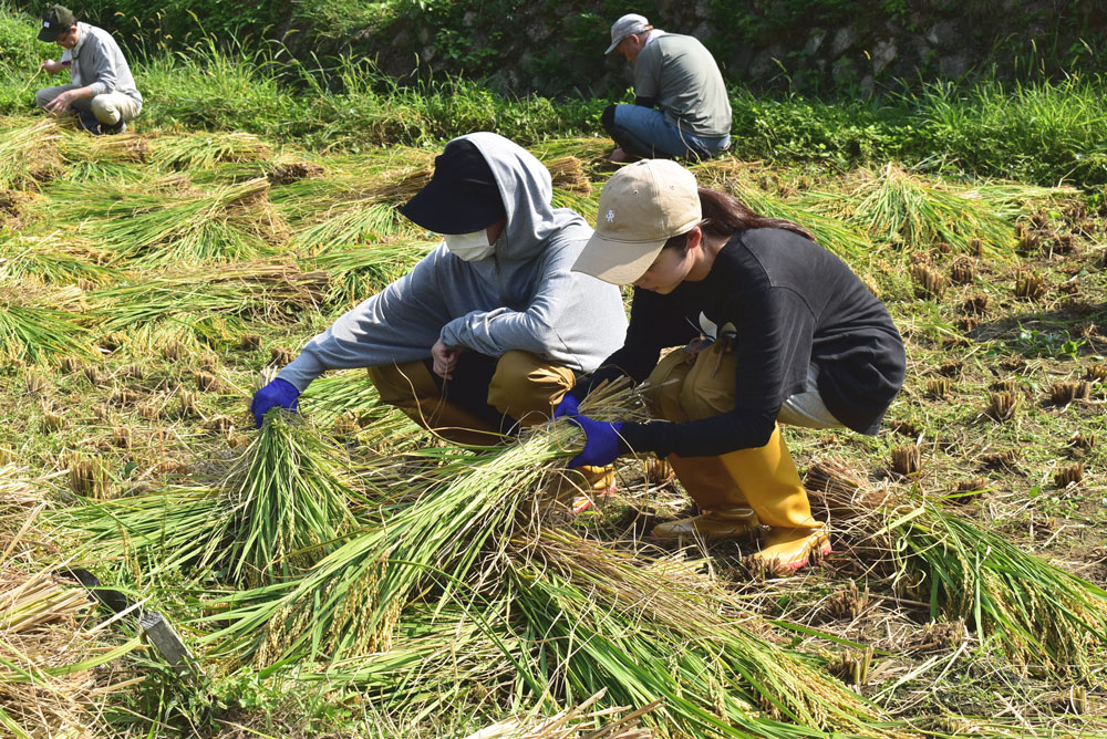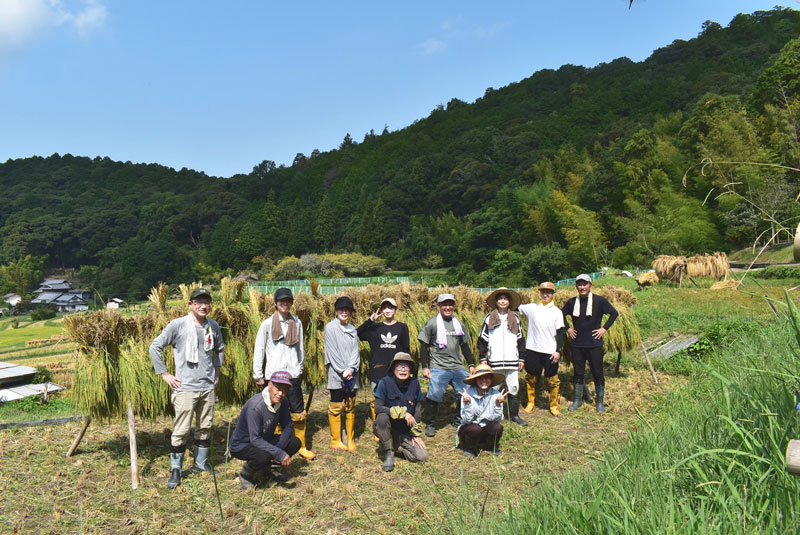 こちらも15分ほどで稲刈りが終了、束にまとめてその日の稲刈りはすべて終了いたしました。