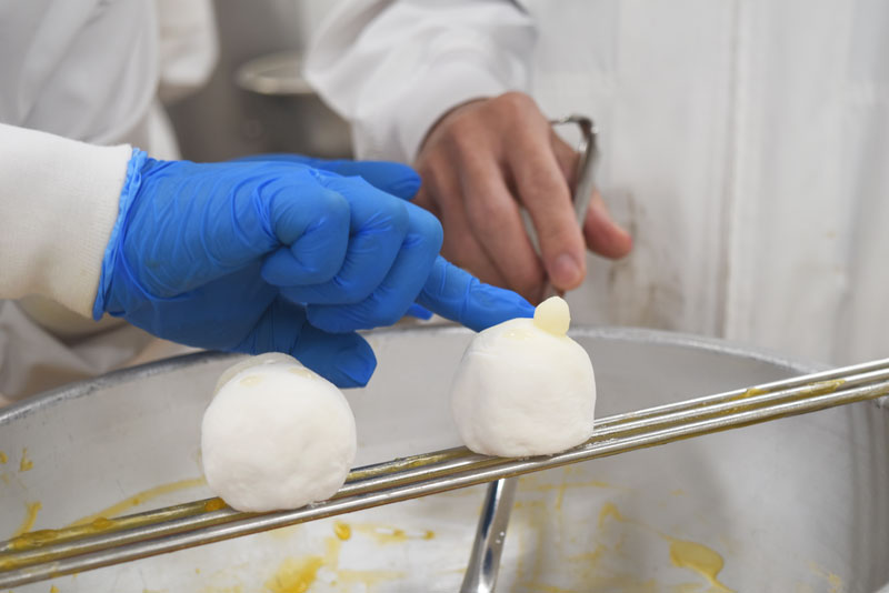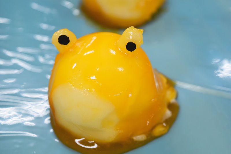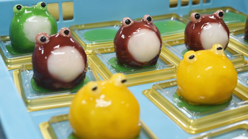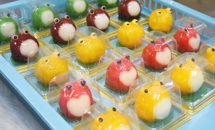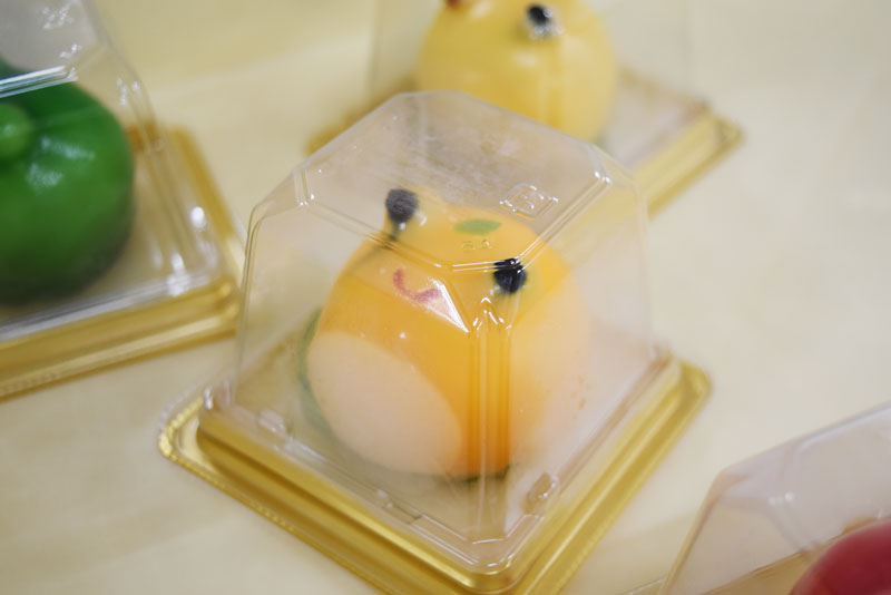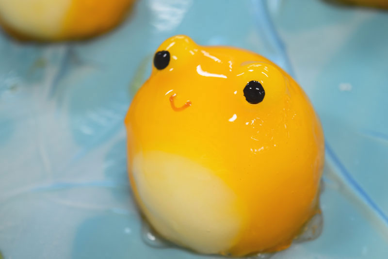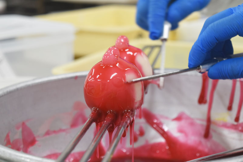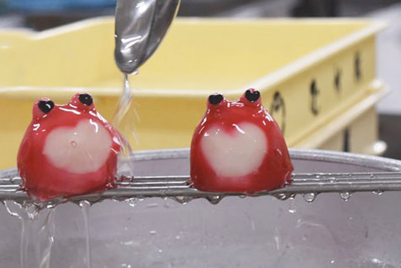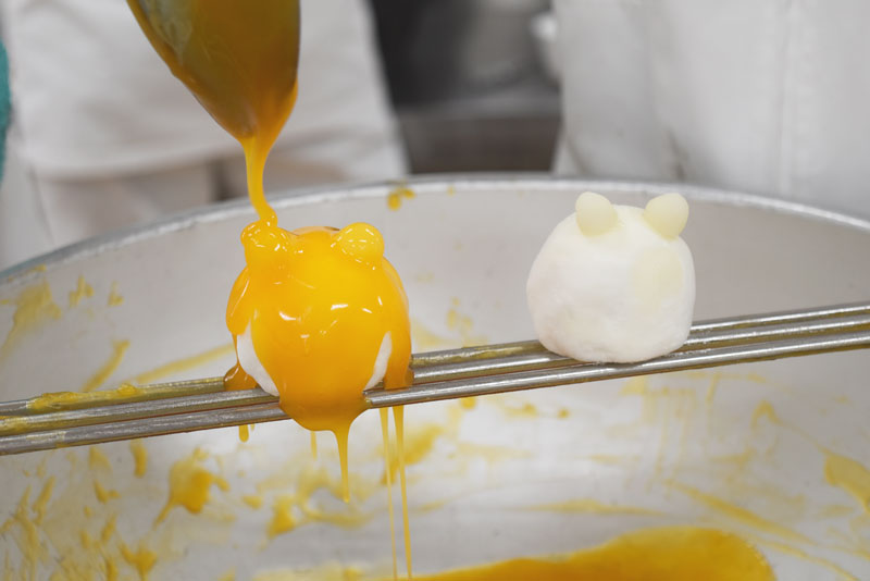 そして、すべてのパーツがそろうと色付けた羊羹を大福にかけていきます。
