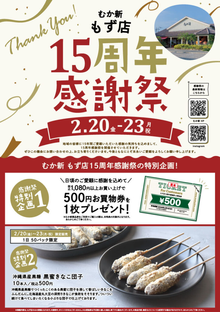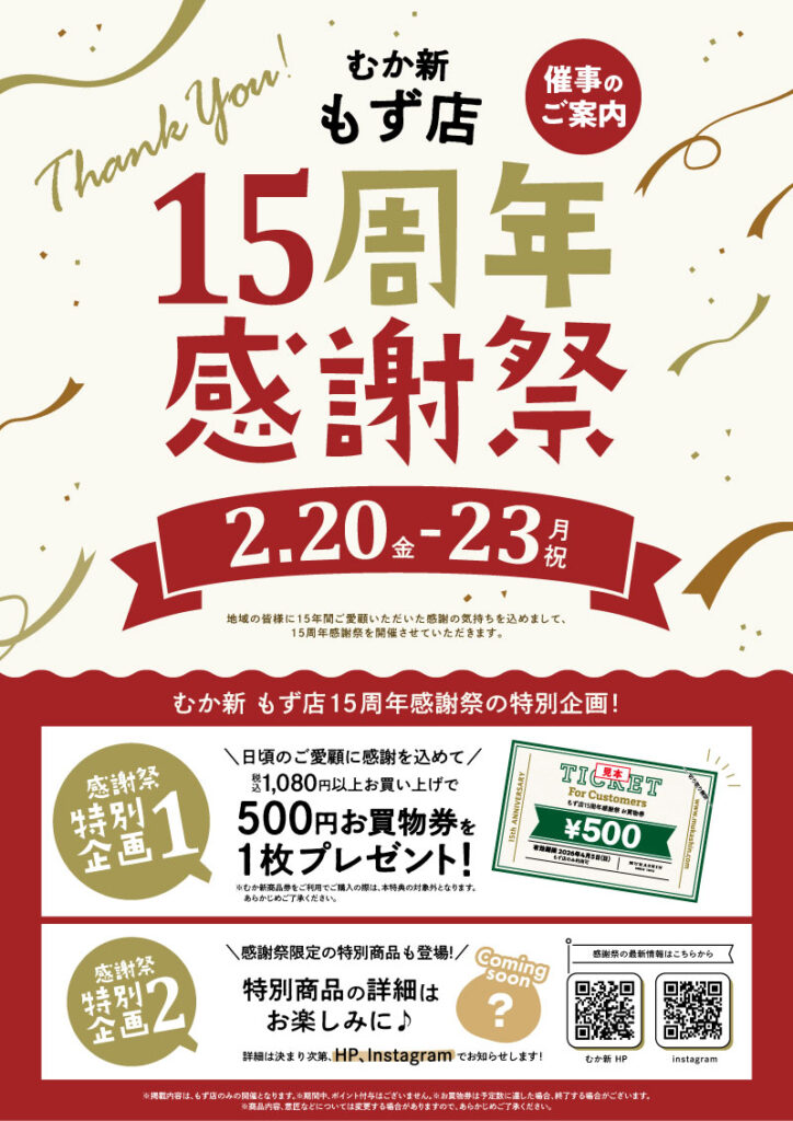 『もず店15周年感謝祭』を2月20日(金)~2月23日(月・祝)の4日間開催いたします。