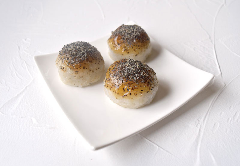泉佐野市の日本遺産、日根荘で収穫された弾力のあるもち米をつかい、十勝産のこし餡を包み、みたらしのたれをかけ黒ゴマをふりかけました。