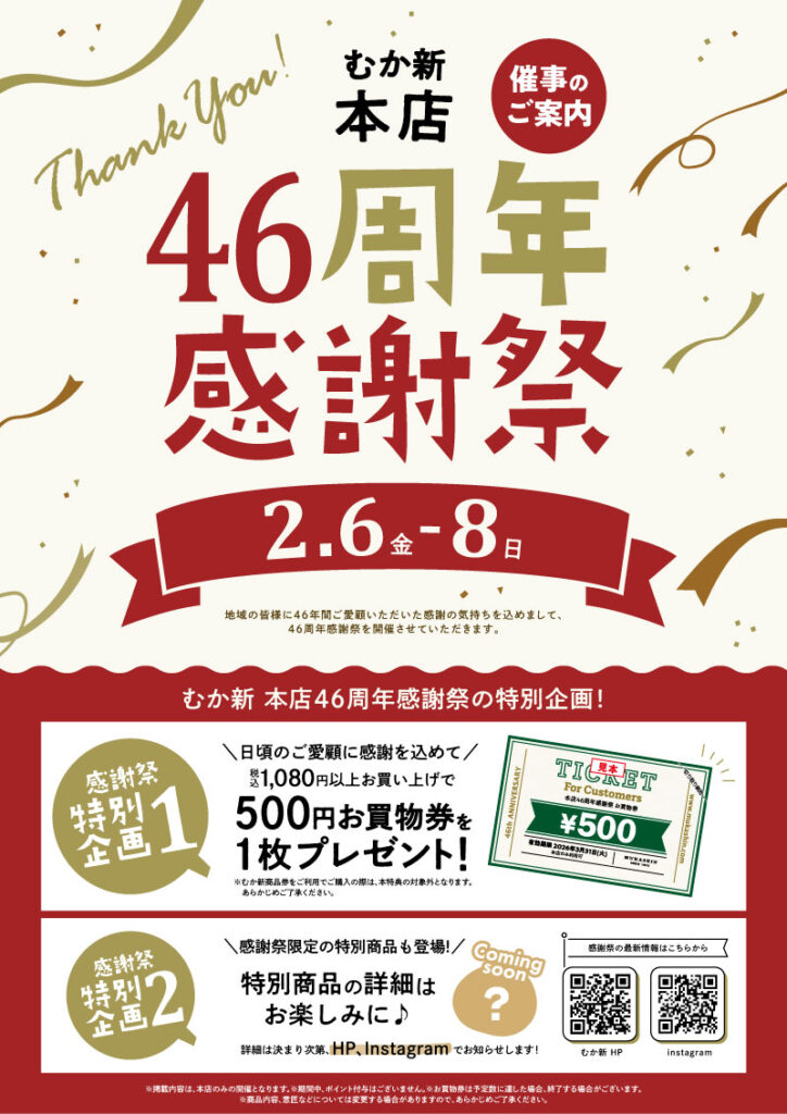 昭和55年に本店を開店し46年が過ぎました。地域の皆様に46年間のご愛顧いただいた感謝の気持ちを込めまして、『本店46周年感謝祭』を2月6日(金)~2月8日(日)の4日間開催いたします。