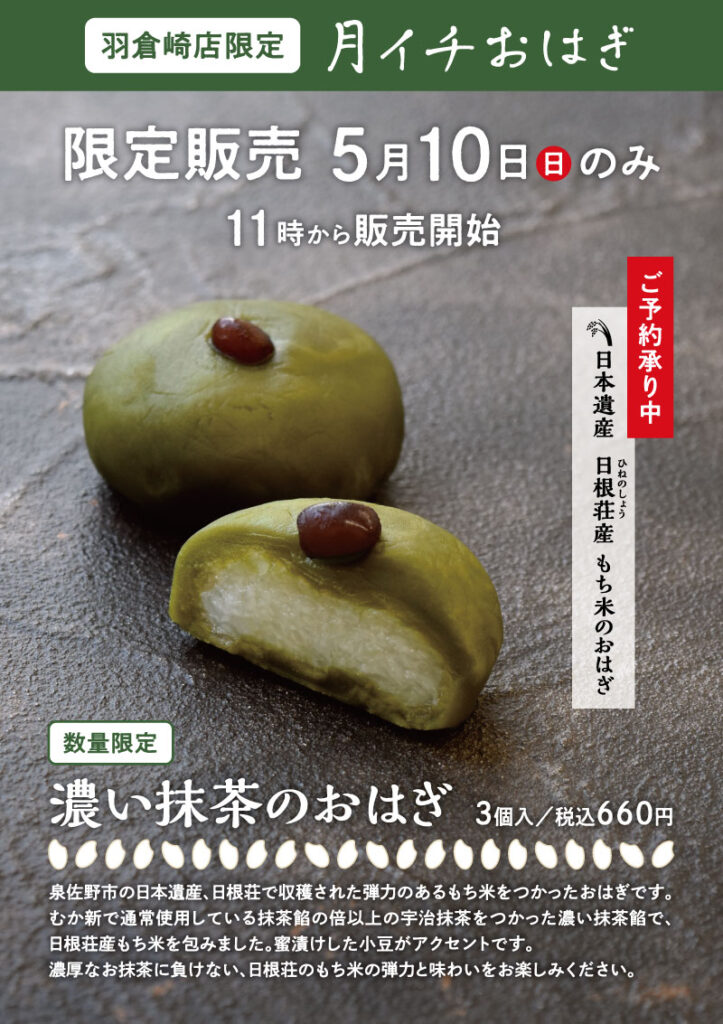 5月10日(日) のみ11時から『濃い抹茶のおはぎ』を数量限定販売