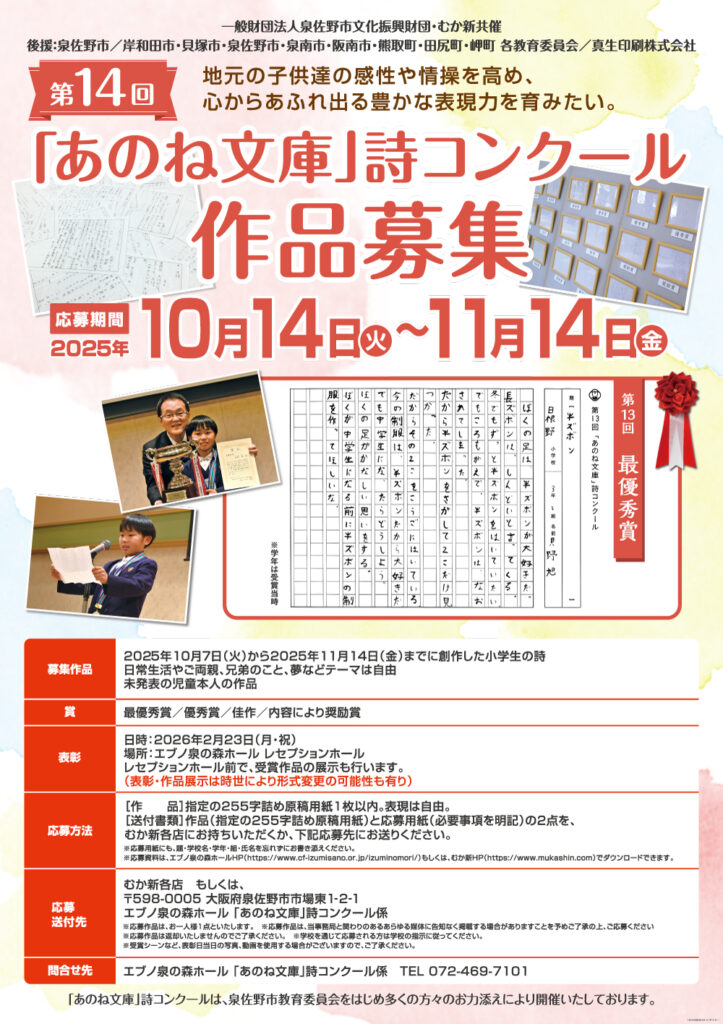むか新では毎年、地元の子供達の感性や情操を高め、心から溢れ出る豊かな表現力を育みたいという思いで、「あのね帳教育」の創始者である、泉佐野市出身の鹿島和夫先生監修のもと泉佐野市文化振興財団と共催で、あのね文庫詩コンクールを開催しています。